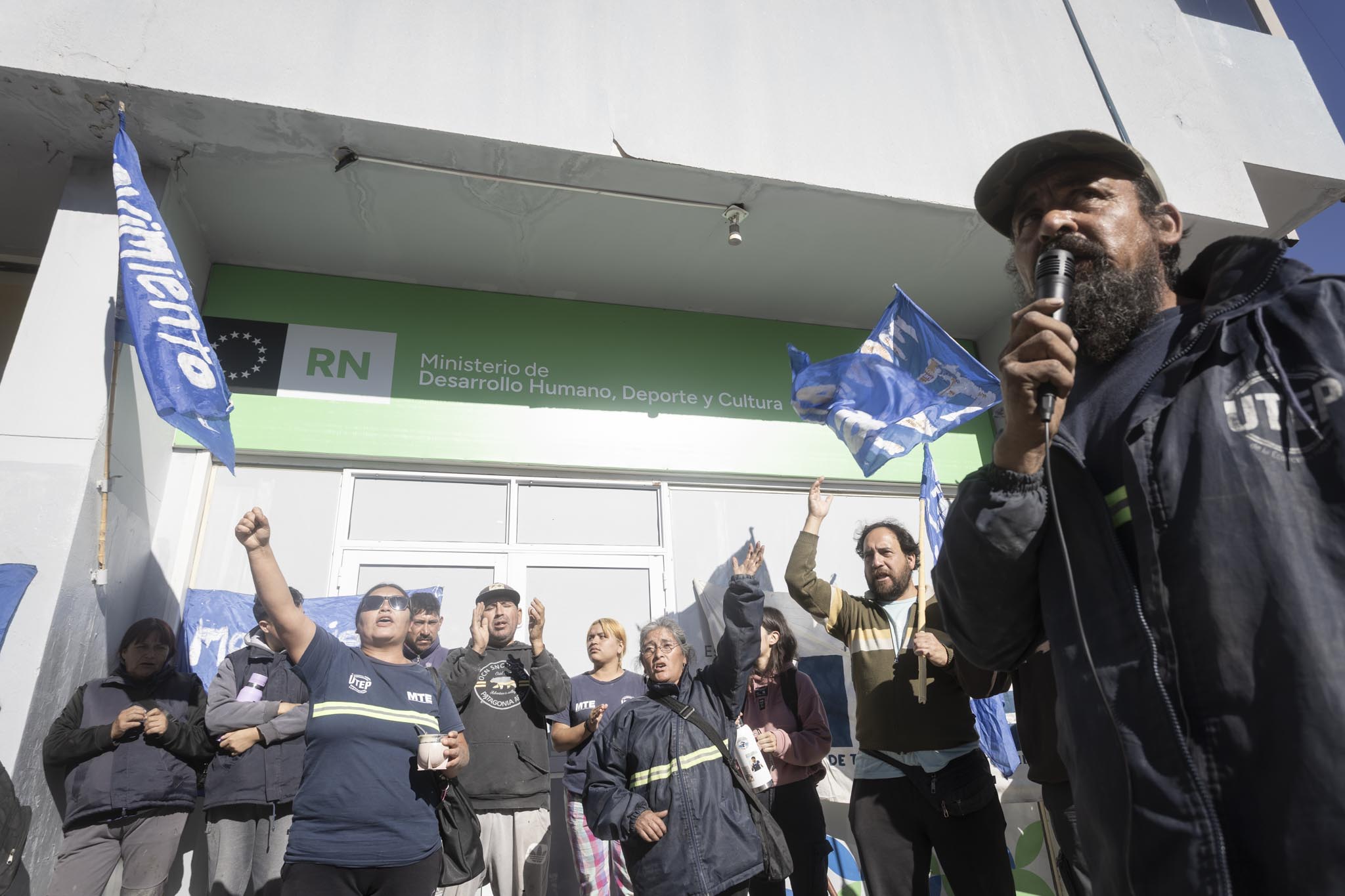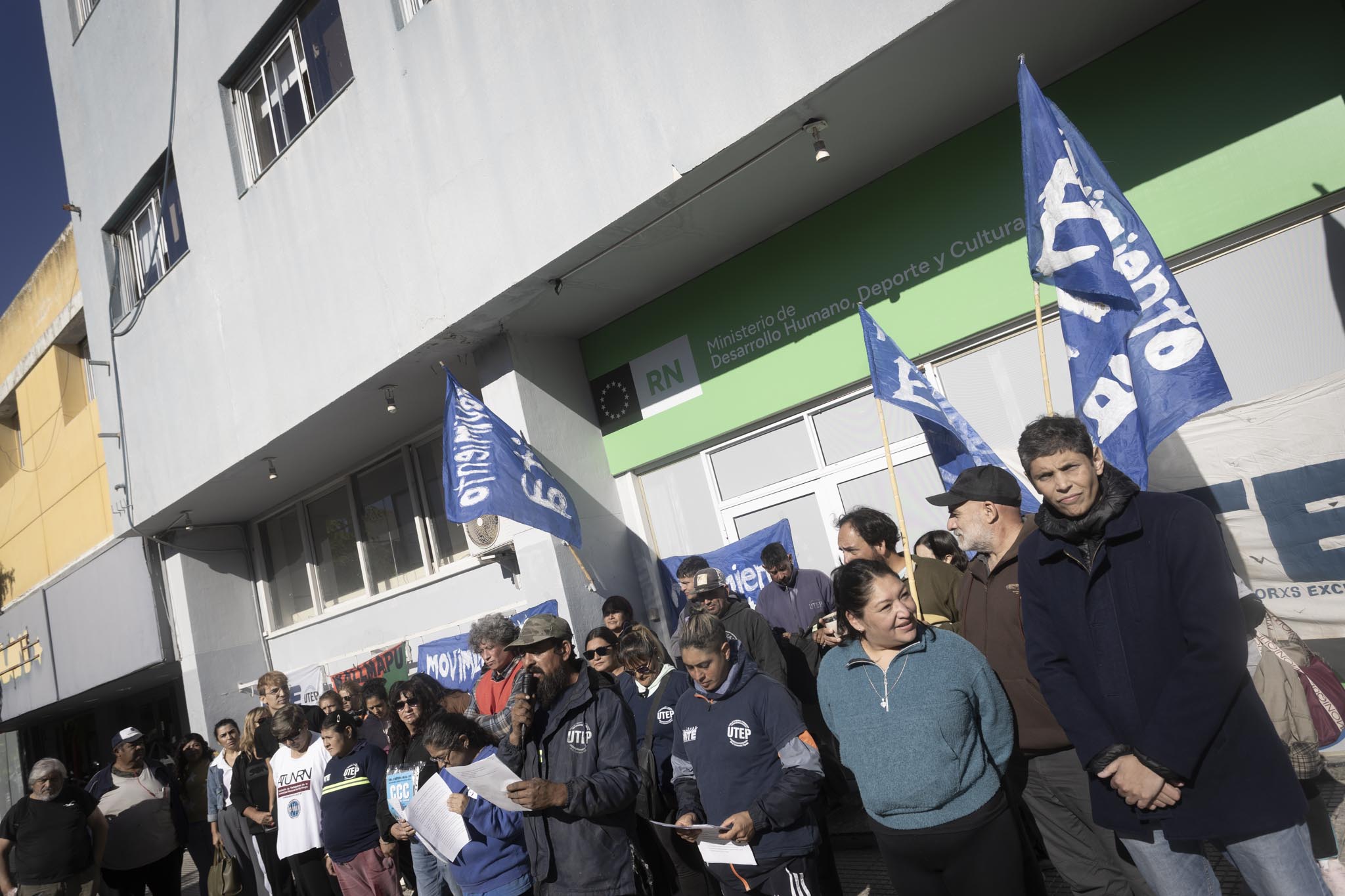 Viedma-07-04-26. Protesta de los trabajadores de la economía popular, frente al Ministerio de Desarrollo Humano, Deporte y Cultura de RN, por la baja y los recortes de los programas nacionales Mi Pieza y Volver al Trabajo.
